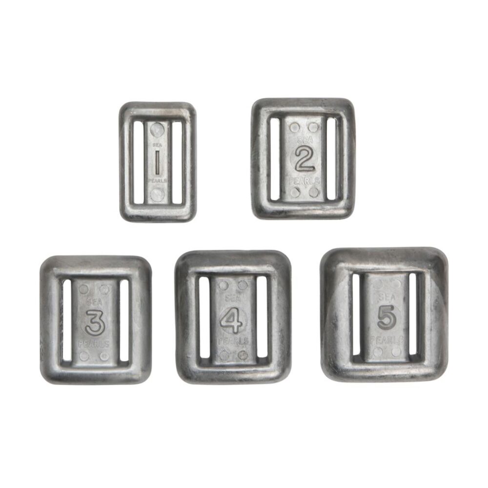These traditional weights, are Sea Pearls most economical weigh and come in 8 sizes. Weights are lace-thru-style for added comfort. The comfortable curved inner shape surface fits around you. All sizes use the same inside-radius for conformity. All corners and edges are round and won't bind or damage exposure suits. Belt webbing paths are recessed into the weight, on both front and back for added comfort. Heavy-duty gear for lifetime of use. Antimony, tin alloy resists deforming and are six times harder than plain lead. Wide belt slots and strong, thick cross section prevents the clamping of weights onto your belt when dropped.